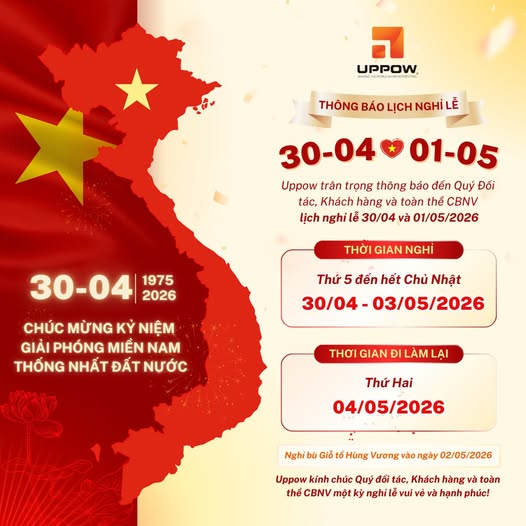 Hòa chung không khí hân hoan của cả nước chào mừng kỷ niệm ngày Giải phóng miền Nam, thống nhất đất nước (30/04/1975 – 30/04/2026) và ngày Quốc tế Lao động 01/05, Công ty Cổ phần Truyền thông Công nghệ UPPOW xin trân trọng thông báo lịch nghỉ lễ như sau: